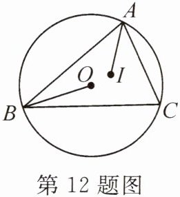 12. (2023·聊城改编)如图,点 O 是△ABC 外接圆的圆心,点 I 是△ABC 的内心,连接 OB,IA。若∠CAI = 35°,则∠OBC 的度数为