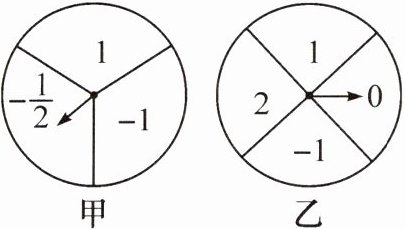 14. 如图,甲、乙为两个可以自由转动的质地均匀的转盘,甲转盘被分成 3 个面积相等的扇形,乙转盘被分成 4 个面积相等的扇形,每一个扇形都标有相应的数字,同时转动两个转盘,当转盘停止后,设甲转盘中指针所指区域内的数字为$m$,乙转盘中指针所指区域内的数字为$n$(若指针指在边界线上,重转一次,直到指针指向一个区域为止)。