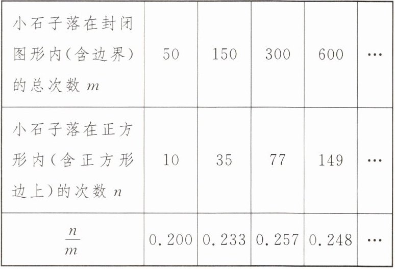 (1)根据表中的数据,如果掷一次小石子,那么小石子落在正方形内(含正方形边上)的概率约为