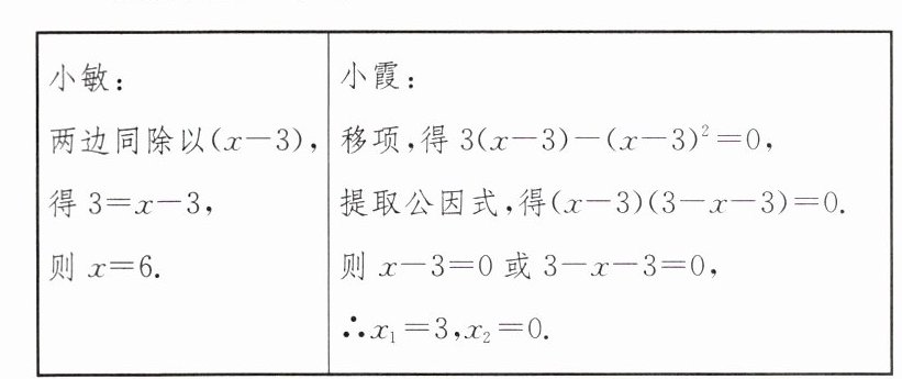 答:移项,得$3(x-3)-(x-3)^{2}=0$.提取公因式,得$(x-3)(3-x+3)=0$.则$x-3=0$或$3-x+3=0,\therefore x_{1}=3,x_{2}=6.$