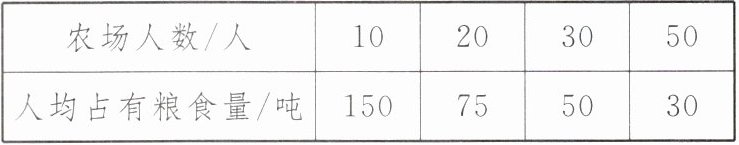 9. 某农场的粮食总产量为 1500 吨,农场共有$y$人,人均占有粮食$x$吨.根据表格所给数据,请写出农场人数$y$(人)和人均占有粮食量$x$(吨)之间的关系式:
