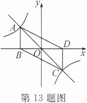 13. 如图,在平面直角坐标系中, $ □ ABCD $ 的对角线交于原点 $ O $,顶点 $ A, C $ 在反比例函数 $ y=\frac{k}{x} $ 的图象上.若 $ CD \perp x $ 轴于点 $ D $, $ □ ABCD $ 的面积为 8,则 $ k= $
