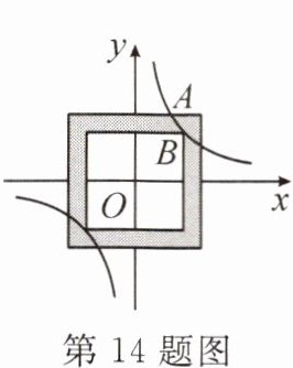 14. 如图,大、小两个正方形的中心均与平面直角坐标系的原点 $ O $ 重合,边分别与坐标轴平行,反比例函数 $ y=\frac{k}{x} $ 的图象与大正方形的一边交于点 $ A(1,2) $,且经过小正方形的顶点 $ B $,则图中阴影部分的面积为