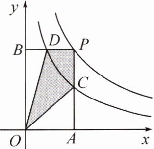 9. 反比例函数 $ y = \frac{k}{x} $ 和 $ y = \frac{2}{x} $ 在第一象限内的图象如图所示,点 $ P $ 在 $ y = \frac{k}{x} $ 的图象上,过点 $ P $ 作 $ PA \perp x $ 轴于点 $ A $,交 $ y = \frac{2}{x} $ 的图象于点 $ C $,$ PB \perp y $ 轴于点 $ B $,交 $ y = \frac{2}{x} $ 的图象于点 $ D $。当点 $ P $ 的横坐标逐渐变大时,四边形 $ OCPD $ 的面积(