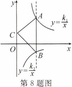 8. 如图,平行于 $ y $ 轴的直线分别交 $ y = \frac{k_1}{x} $ 与 $ y = \frac{k_2}{x} $ 的图象(部分)于点 $ A,B $,点 $ C $ 是 $ y $ 轴上的动点,则 $ \triangle ABC $ 的面积为(