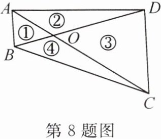 8. 如图,四边形$ABCD$的对角线$AC$,$BD$相交于点$O$,且将这个四边形分成①②③④四个三角形. 若$OA:OC = OB:OD$,则下列结论中一定正确的是(