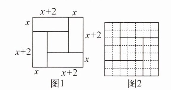 16. 新考向 数学文化 (2023·贵阳期中)我国古代数学家赵爽(公元 3 - 4 世纪)在其所著的《勾股圆方图注》中记载过一元二次方程(正根)的几何解法. 以方程 $ x^{2} + 2x - 35 = 0 $ 即 $ x(x + 2) = 35 $ 为例说明, 记载的方法是: 构造图 1, 大正方形的面积是 $ (x + x + 2)^{2} $, 同时它又等于四个矩形的面积加上中间小正方形的面积, 即 $ 4 × 35 + 2^{2} $, 因此 $ x = 5 $. 则图 2 是下列哪个方程的几何解法 (