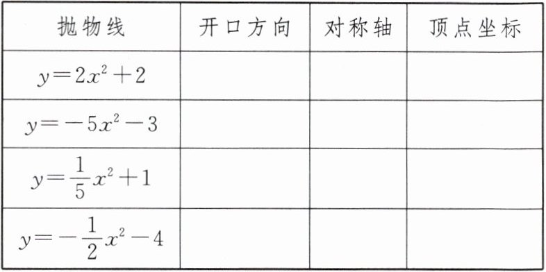 | 抛物线 | 开口方向 | 对称轴 | 顶点坐标 |