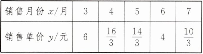 ∴销售单价 y(元)与销售月份 x(月)满足的关系式为 y=-2/3x+8.