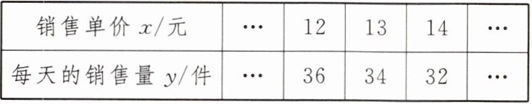 7. (2024·遵义汇川区期末)某超市以每件10元的价格购进一种文具,销售时该文具的销售单价不低于进价且不高于19元. 经过市场调查发现,该文具每天的销售量 $ y $(件)与销售单价 $ x $(元)之间满足一次函数关系,部分数据如下表所示: