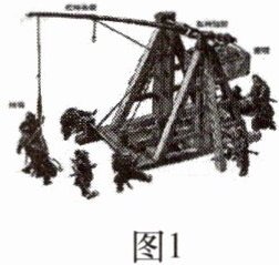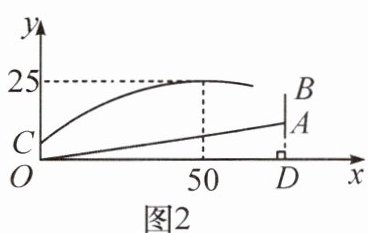 12. 新考向 传统文化 如图 1 所示的是古代的一种远程投石机,其投出去的石块运动轨迹是抛物线的一部分.据《范蠡兵法》记载:“飞石重二十斤,为机发,行三百步”,其原理蕴含了物理中的“杠杆原理”.在如图 2 所示的平面直角坐标系中,将投石机置于斜坡 $ OA $ 的底部(原点 $ O $ 处),石块从投石机竖直方向上的点 $ C $ 处被投出,在斜坡上的点 $ A $ 处建有垂直于水平面的城墙 $ AB $.已知,石块运动轨迹所在抛物线的顶点坐标是 $ (50,25) $,$ OC = 5 $, $ OD = 75 $,$ AD = 12 $,$ AB = 9 $.