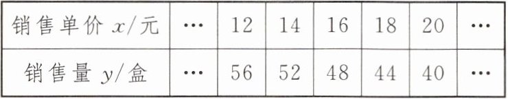 11. (2024·贵州)某超市购入一批进价为 10 元/盒的糖果进行销售,经市场调查发现:销售单价不低于进价时,日销售量 $ y $(盒)与销售单价 $ x $(元)是一次函数关系,下表是 $ y $ 与 $ x $ 的几组对应值.