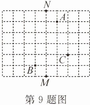 9. 在如图所示的方格纸中,每个小正方形的边长均为 $1$。若以 $MN$ 所在的直线为 $y$ 轴(向上为正方向),以小正方形的边长为 $1$ 个单位长度建立平面直角坐标系,使点 $A$ 与点 $B$ 关于原点对称,则点 $C$ 的坐标是