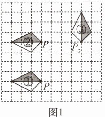 (1)图形①向上平移 4 格得到图形②;图形②以点 P₁ 为旋转中心,顺时针旋转 90°后,再向右平移 4 格得到图形③.