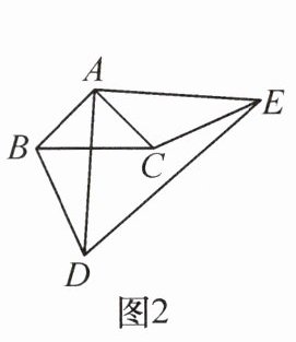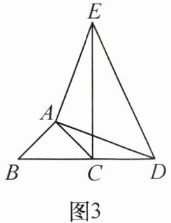 【实践探究】(2)如图 3,当△ADE 绕点 A 逆时针旋转,使得点 D 落在 BC 的延长线上时,连接 CE。