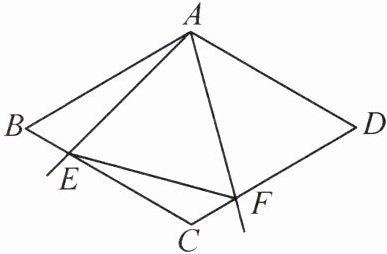 3. 如图,在菱形 ABCD 中,AB = 4,∠BAD = 120°,以点 A 为顶点的一个 60°的∠EAF 绕点 A 旋转,∠EAF 的两边分别交 BC,CD 于点 E,F,且点 E,F 不与点 B,C,D 重合,连接 EF。