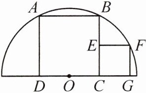 16. 如图,已知正方形 ABCD 在半圆 O 的内部,顶点 A , B 在圆上, C , D 在直径上,在正方形 ABCD 右侧再作一个小正方形 ECGF ,点 F 在圆上. 若正方形 ABCD 的边长为 4 ,则正方形 ECGF 的边长为