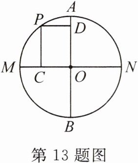13. 如图, AB , MN 是$ \odot O $中互相垂直的直径,点 P 在$ \overset{\frown}{AM} $上,且不与点 A , M 重合,过点 P 作 AB , MN 的垂线,垂足分别是 D , C . 当点 P 在$ \overset{\frown}{AM} $上移动时,矩形 PCOD 的形状、大小随之变化,则$ PC^{2} + PD^{2} $的值 (