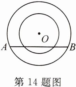 14. (教材九上 P101 习题 T5 变式) 如图,以点 $ O $ 为圆心的两个同心圆中,大圆的半径为 $ 5 $,小圆的半径为 $ 3 $。若大圆的弦 $ AB $ 与小圆有公共点,则弦 $ AB $ 的取值范围是。