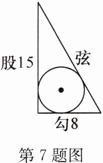 7. 新考向 数学文化(2023·镇江)《九章算术》中记载:“今有勾八步,股一十五步.问勾中容圆径几何?”译文:今有一个直角三角形,勾(短直角边)长为8步,股(长直角边)长为15步,问该直角三角形内切圆的直径是多少?书中给出的算法译文如下:如图,根据勾、股,求得弦长.用勾、股、弦相加作为除数,用勾乘股,再乘2作为被除数,商即为该直角三角形内切圆的直径,求得该直径等于