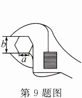 9. 新考向 真实情境 (教材九上 P108 习题 T5 变式)如图,工人师傅用扳手拧形状为正六边形的螺帽,现测得扳手的开口宽度 $b = 3\mathrm{cm}$,则螺帽边长 $a=$