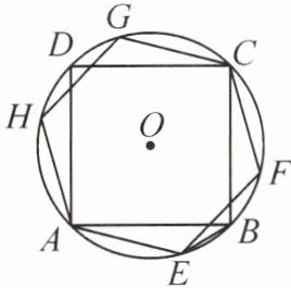 (2)BE是$\odot O$的内接正十二边形的一边.理由:连接OA,OB,OE.在正方形ABCD中,$\angle AOB=90^{\circ}$,在正六边形AEFCGH中,$\angle AOE=60^{\circ}$,$\therefore \angle BOE=30^{\circ}$.$\because \frac{360^{\circ}}{30^{\circ}}=12$,$\therefore BE$是$\odot O$的内接正十二边形的一边,$n=12$.