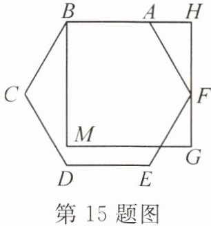 15. (教材九上 P109 习题 T6 变式)如图,正六边形 $ABCDEF$ 的顶点 $A$,$F$ 分别在正方形 $BMGH$ 的边 $BH$,$GH$ 上.若正方形 $BMGH$ 的边长为 6,则正六边形 $ABCDEF$ 的边长为