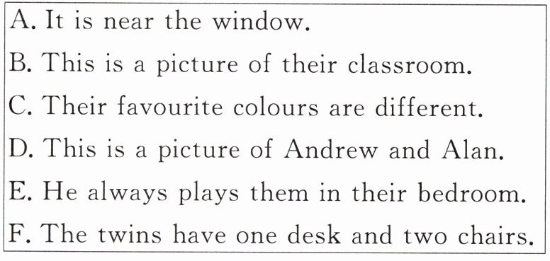 ____32____ Andrew's favourite colour is black, but Alan likes purple best. Look at their bedroom. The two beds look the same. This bed is Andrew's. ____33____ That one is Alan's. It's near the door. Andrew's things are everywhere on the bed, but Alan's bed is very tidy. ____34____ Their clock, books and pencils are on the desk. Their schoolbags are on the chairs.