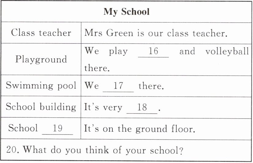 16. basketball 17. take swimming lessons 18. large 19. hall 20. I think it's big and beautiful. / ...