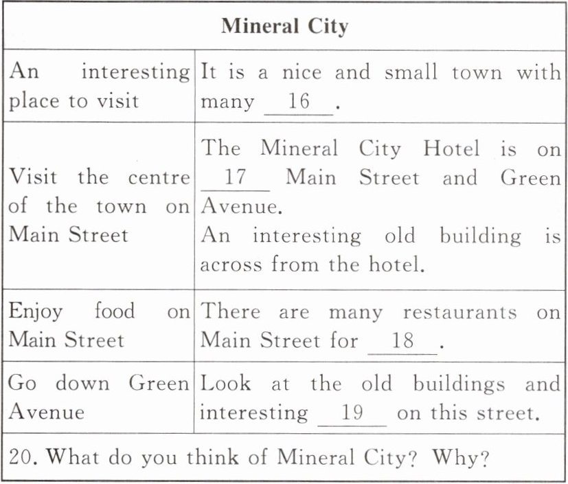 16. old buildings 17. the corner of 18. lunch or dinner 19. shops 20. I think it's a good place to visit. Because it has a long history. /I think it's interesting. Because there are some interesting stores in it. /...