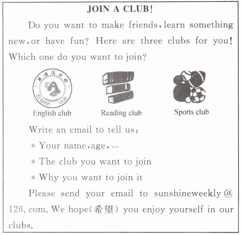 假如你是阳光中学七年级五班的学生 Wendy,你看到了英语校刊 *Sunshine Weekly* 发布的一则俱乐部招新启事。请你根据启事的内容与要求,用英语写一封不少于60词的邮件,申请加入其中一个俱乐部。