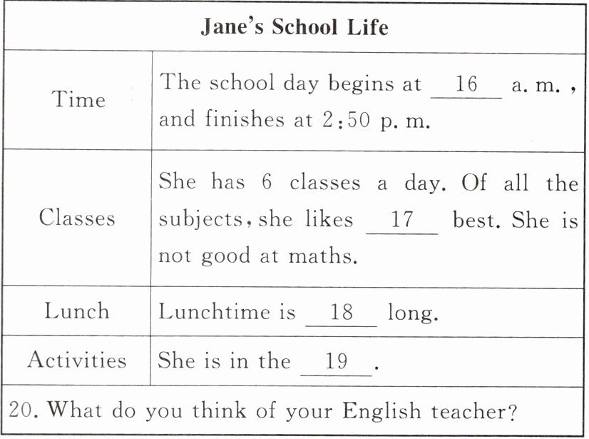 16.8:00 17.English 18.an/one/1 hour 19.art club 20.She is strict but really cares about us./...