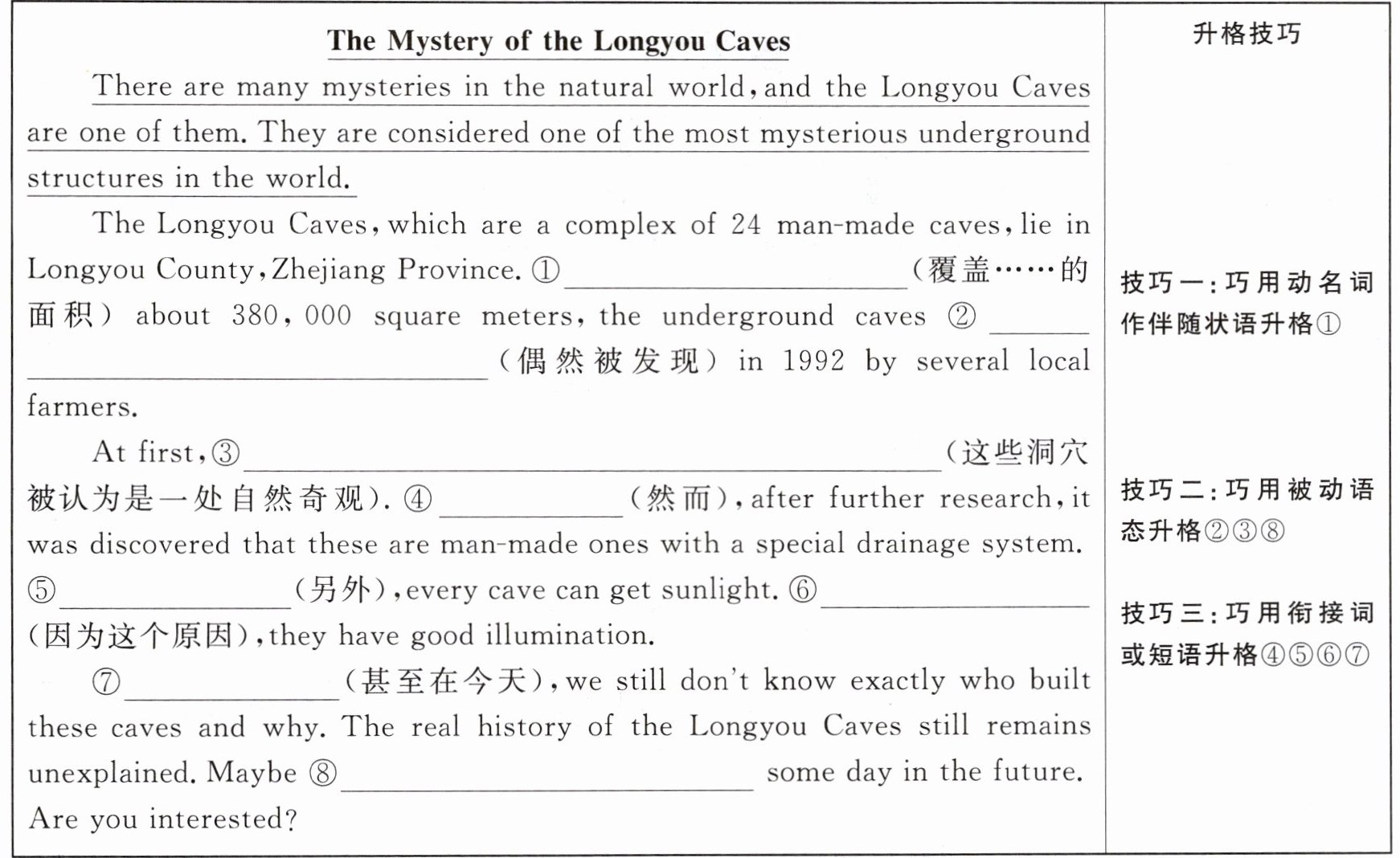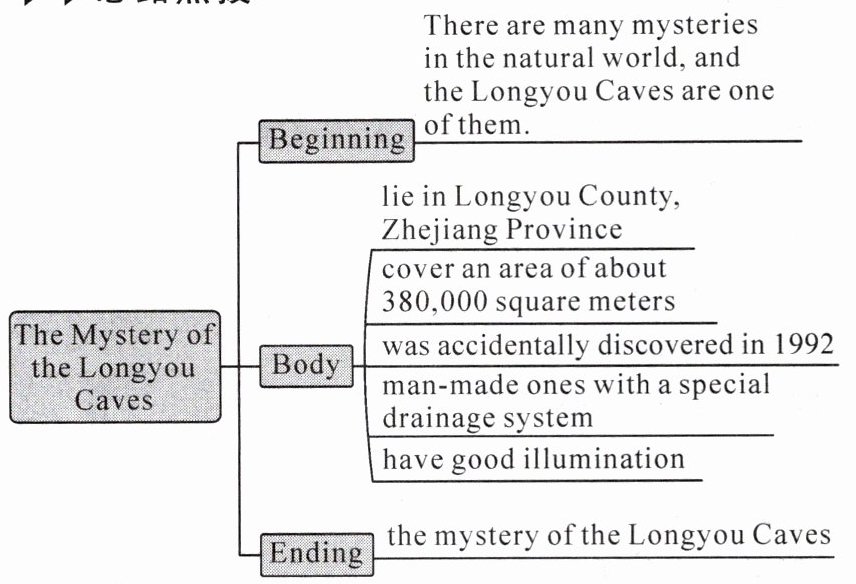 1992年,一个庞大的地下石窟群在浙江省龙游县被几位农民偶然发现,人们称其为龙游石窟。很快,人们发现这些石窟并非天然形成。那么,这些石窟是何时建造的?是谁建造的?为何建造?这些在史书上均无记载。这使得龙游石窟成为世界上最神秘的地下建筑之一。请你根据下列提示,写一篇题为“The Mystery of the Longyou Caves”的短文,参加下周主题为“World Mystery”的英语活动课。词数100左右,开头已给出,不计入总词数。