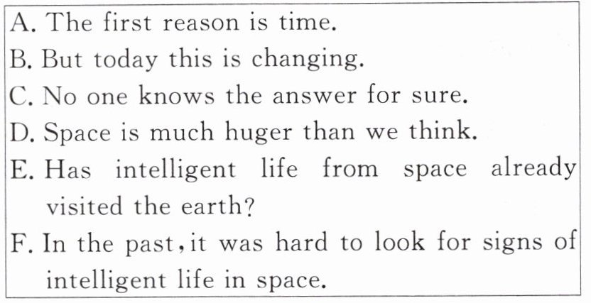 Why do astronomers think intelligent life exists on other planets? 8. _______ Scientists believe the space is about 12 billion years old. “This is long enough for other planets to have intelligent life,” Shostak and Barnett say. Another reason is size. 9. _______ “Tools like the Hubble Space Telescope have shown that there are at least 100 billion galaxies(星系),” says Shostak. “And our galaxy, the Milky Way, has at least 400 billion stars. Some planets going around these stars might be similar to the earth.”