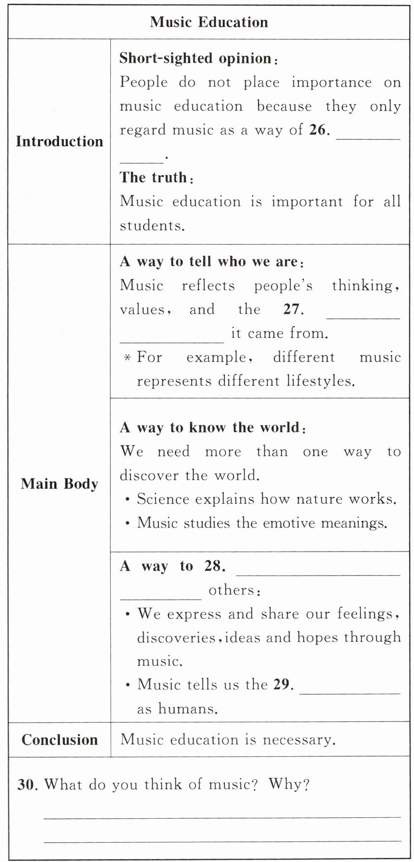 26. having fun 27. social environment 28. communicate with/"talk" to 29. meanings 30. I think music is amazing. Because it can cheer me up when I'm down and help me relax. /...