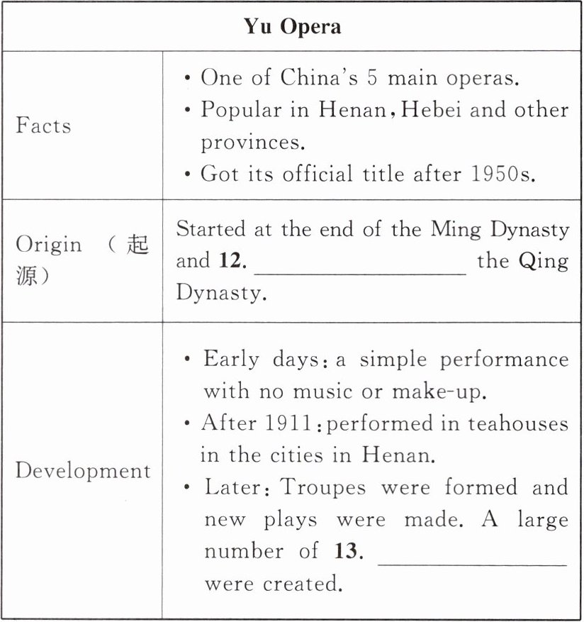 Yu Opera was born at the end of the Ming Dynasty and the beginning of the Qing Dynasty. In the beginning,it was only a simple performance without any music or make-up. After 1911,Yu Opera was performed in famous teahouses in the cities in Henan Province,where it could compete with Beijing Opera. Later, there were troupes( 剧团) of Yu Opera in China. So a large number of new dramas were created,leading Yu Opera to a new level.