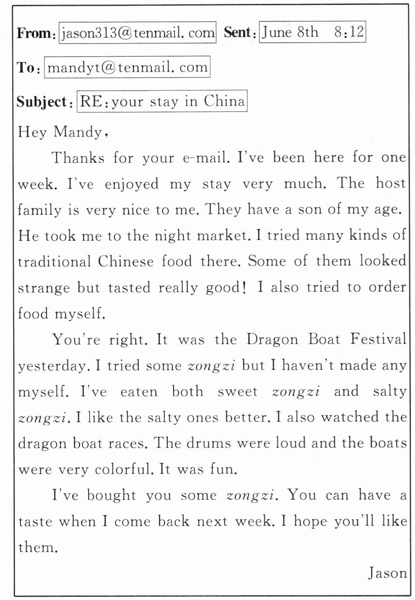 ( )22. How long has Jason been in China?