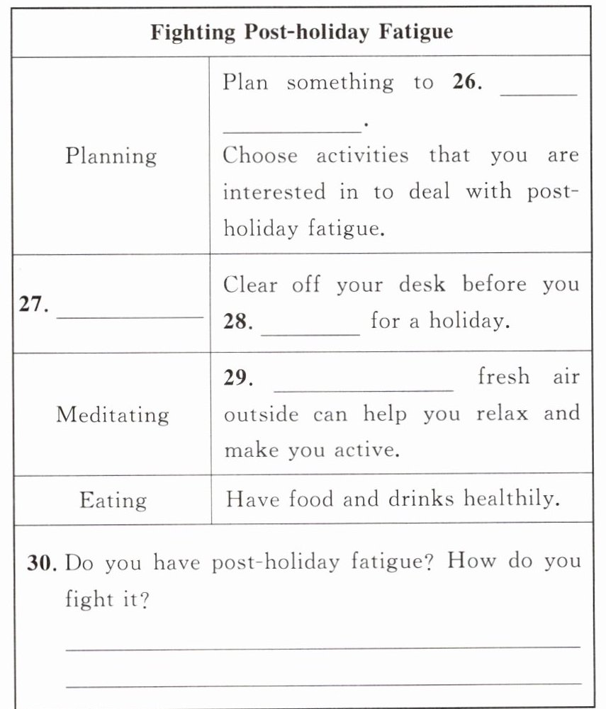 26. look forward to 27. Organizing 28. leave 29. Breathing 30. Yes, I do. I fight it by getting enough sleep, exercising, and starting with easy tasks. / ...