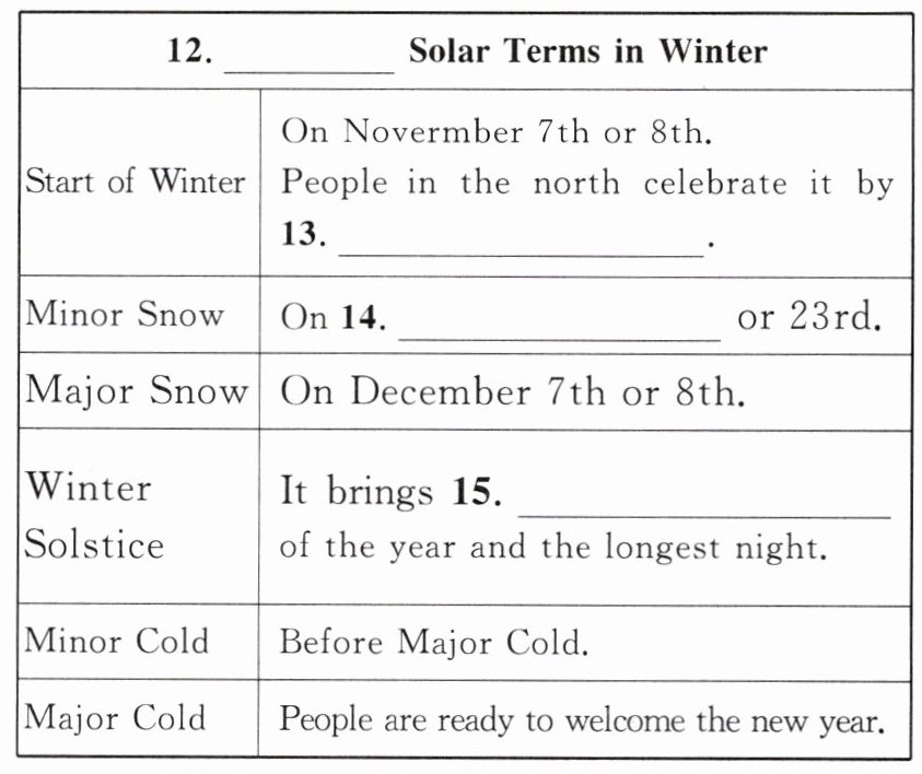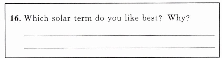 第二节 12. Six/6 13. having dumplings 14. November 22nd 15. the shortest day 16. I like Start of Autumn best. Because it's not hot any longer. / ...