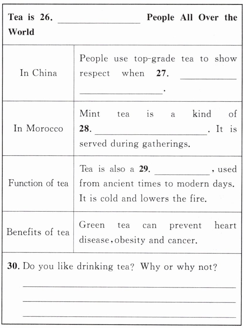 26. Welcomed by 27. receiving important guests 28. traditional/green tea 29. medicine 30. Yes, I do. Because there are many benefits of drinking tea. /No, I don't. Because the smell of tea is too strong for me. / ...