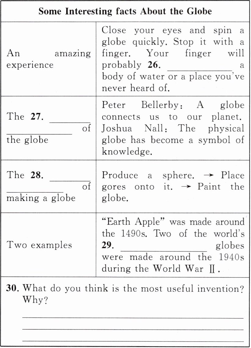 26. land on 27. value/importance 28. steps/process 29. most famous 30. I think the most useful invention is the light bulb because we can have more time to learn, work and have fun. / ...