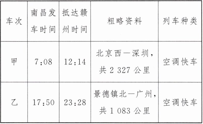6. 小明的家在南昌,他的爸爸最近要去赣州办事,小明上网一查,发现从南昌到赣州的列车很多。下面是他查到的列车时刻表中的一部分,则坐甲次列车从南昌到赣州需要的时间是(