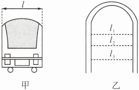 15. (2023·常州)如图甲所示,西班牙制造的新式列车车厢的宽度 $ l = 3.500 $ m。为判断新式列车车厢能否通过一处老式隧道,技术人员分别测量了隧道内部三处的宽度,如图乙所示,测量结果为 $ l_1 = 3.600 $ m、$ l_2 = 3.480 $ m、$ l_3 = 3.540 $ m。技术人员使用的刻度尺分度值为