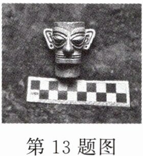 13. (2024·威海)三星堆祭祀区 8 号坑出土了一件迷你版纵目面具,工作人员按照考古挖掘的要求用比例尺作参照拍照,每一个小方格的宽度为 1 cm,如图所示。请估测面具两耳之间的最远距离更接近于(
