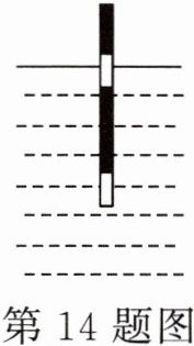 14. (2024·新疆)如图所示为钓鱼时鱼漂静浮于水面的示意图。某次鱼咬钩后,鱼漂从露出水面的长度为 6 cm 竖直向下运动到露出水面的长度为 2 cm 的过程,所用时间为 0.4 s,则该运动过程鱼漂的平均速度为(