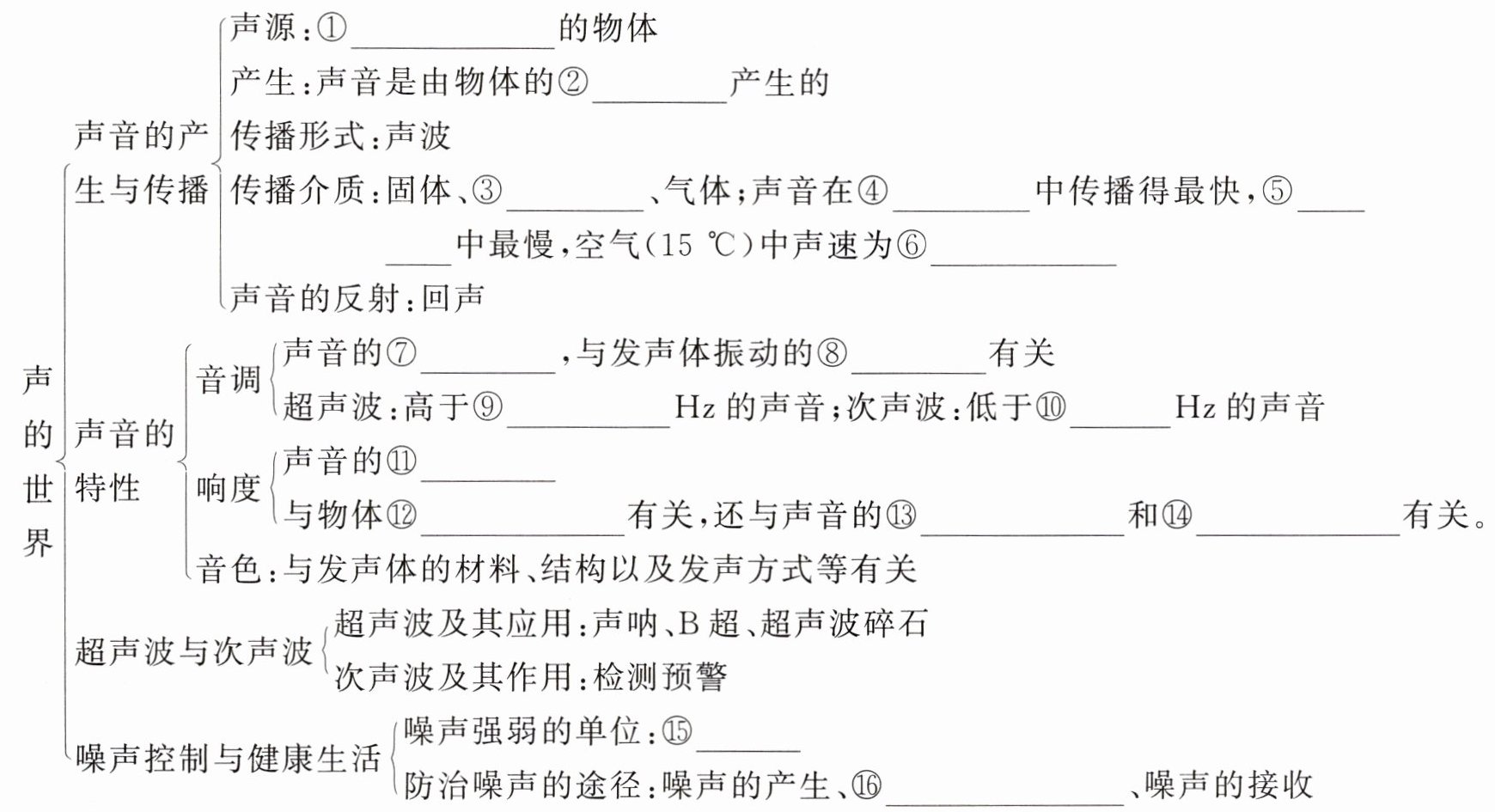 ①正在发声 ②振动 ③液体 ④固体 ⑤气体 ⑥340 m/s ⑦高低 ⑧频率 ⑨20 000 ⑩20 ⑪强弱 ⑫振动幅度 ⑬传播距离 ⑭分散程度 ⑮dB ⑯噪声的传播