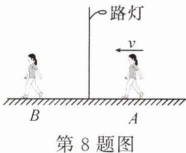 8. 小刘晚上下班回家经过一盏路灯,如图所示,当她从 A 点沿直线走向 B 点的过程中,她的影子长度的变化情况是(