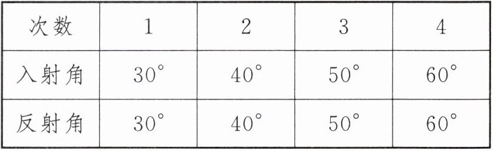 (填“靠近”或“远离”)平面镜。进行实验后的测量数据如下表,由此可得:在反射现象中,反射角等于入射角