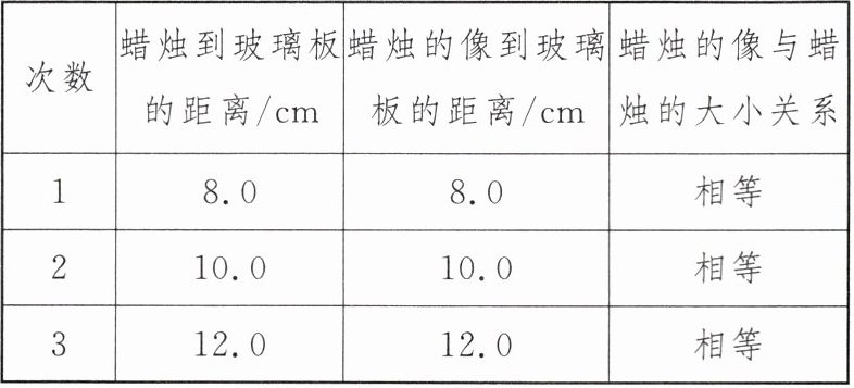 的位置,并用直线连接蜡烛和蜡烛的像所在的位置,量出直线与玻璃板的夹角,用刻度尺分别量出蜡烛和像到玻璃板的距离,进行多次实验,数据记录如下表。(5) 分析表中的实验数据,可以得到平面镜成像的以下结论: