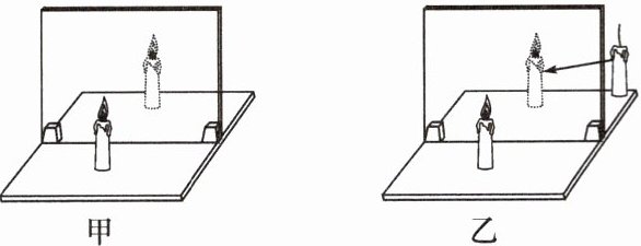 (未点燃的蜡烛看起来也有了烛焰),由此比较点燃蜡烛的像的大小、正倒与蜡烛本身是否一致(图乙)。(4) 在纸上描出蜡烛、玻璃板和